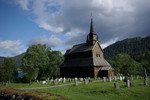 Hinter dem Tunnel taucht Laerdal auf. Wir fahren weiter auf der E 16 in Richtung Kaupanger. Hier soll es einen kleinen Stellplatz geben, den wir für diese Nacht aufsuchen wollen. Zu allererst aber halten wir noch an der wirklich sehr schönen alten Stabkirche von Kaupanger an. Sie liegt etwas oberhalb des kleinen Ortes und ist sehr schön anzusehen. Leider hat sie bereits geschlossen. Helmut macht Fotos und ich geniesse die schöne Landschaft.
